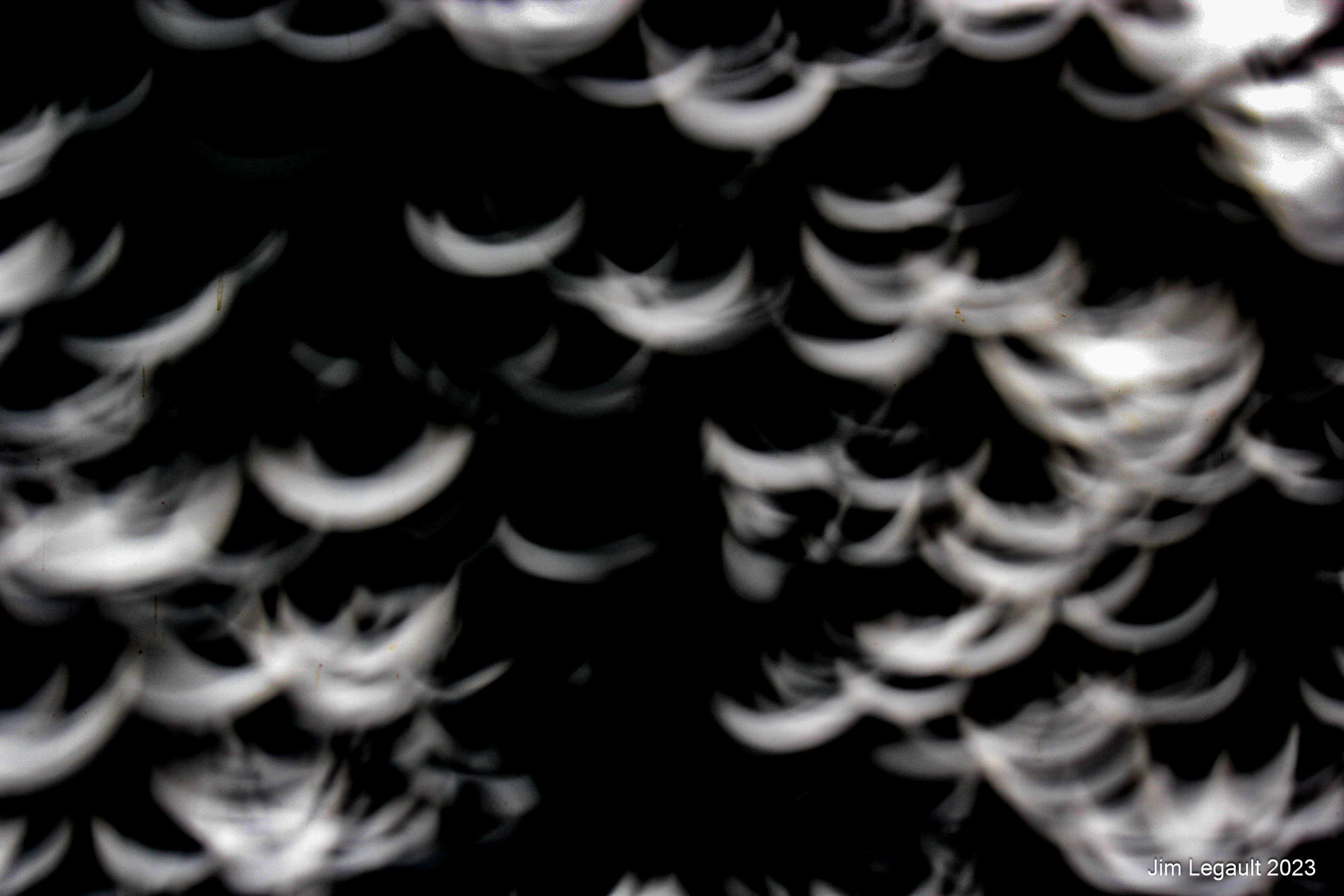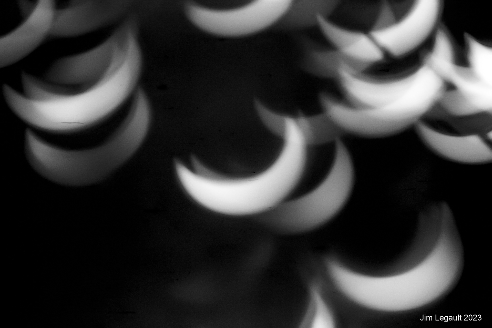 The images of the eclipse are created by a pinhole camera effect as the light passes through tiny openings in a dense foliage cover. Dozens of images are projected to the ground below and also to a white board to capture the projected images. Individual images are below.